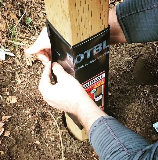 6. When ROTBLOC has been wrapped, your post should sit with two inches of ROTBLOC showing above the ground to protect against the soil, UVA and moisture damage which weakens the wood fibers above the groundline.