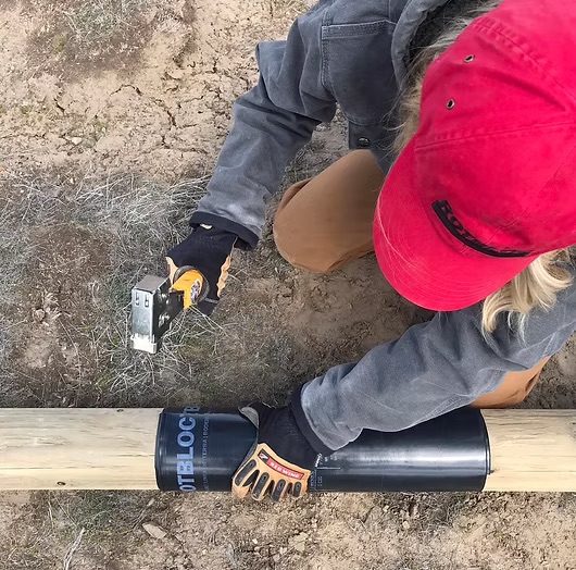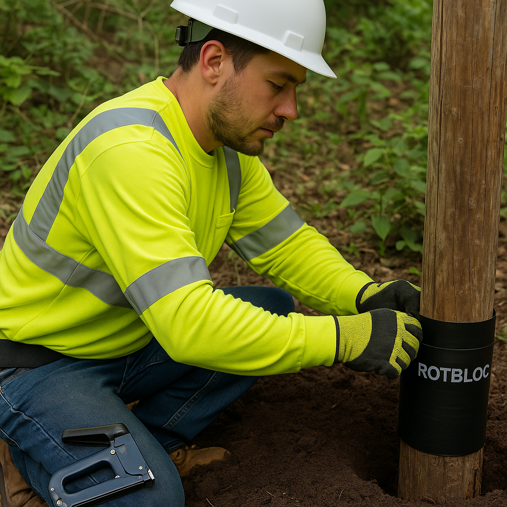 Rotbloc’s installation process is built on practical engineering. Every product—whether protecting utility poles, decking posts, fencing systems, or agricultural structures—follows the same principle: clean the surface, measure and cut the wrap to size, align the ground-line indicator, overlap by two inches, and secure with stainless staples. This unified system minimizes training requirements, shortens setup time, and ensures consistent results across all applications.